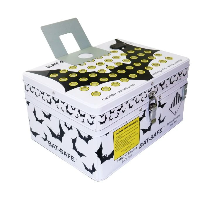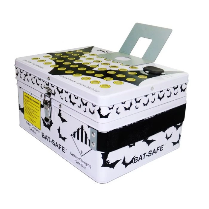 BAT-SAFE is lightweight, easy to use and inexpensive. It has a magnetic attached charger stand, a handle for easy transportation, a fire proof lid seal and wire ways allow access for charging wires.