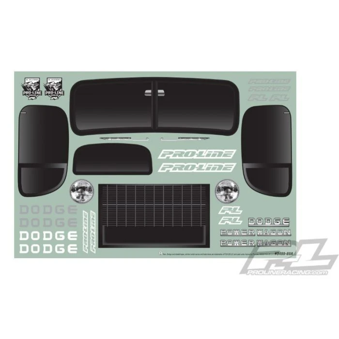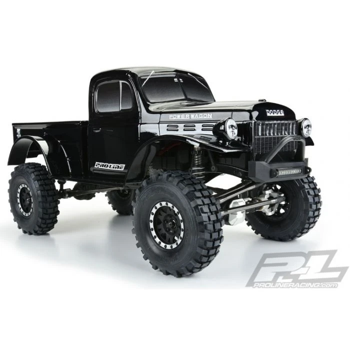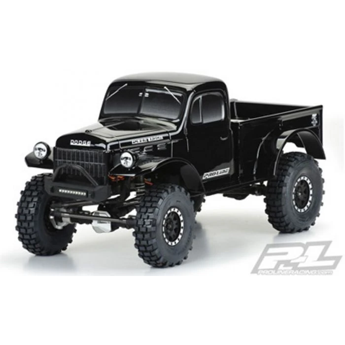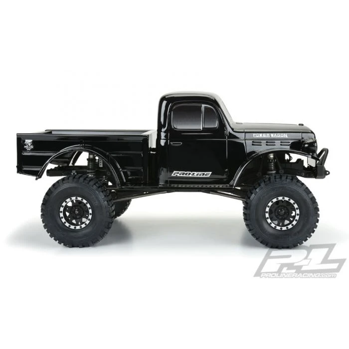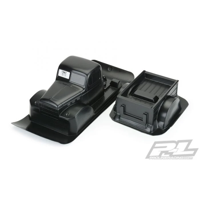This is a 1946 Dodge Power Wagon Tough-Color Black Body for Crawlers. Pro-Line is proud to introduce the 1946 Dodge Power Wagon Black body for Scale Crawlers made from completely black polycarbonate Tough-Color material! This First Gen Power Wagon body style comes as 2 pieces (Cab and Bed) for an ultra-realistic look that stays true to the original military-inspired 4x4 truck that civilians could buy. The Tough-Color polycarbonate is made from black material, so you never have to worry about paint peeling or chipping off. Realistic window stickers are also included!