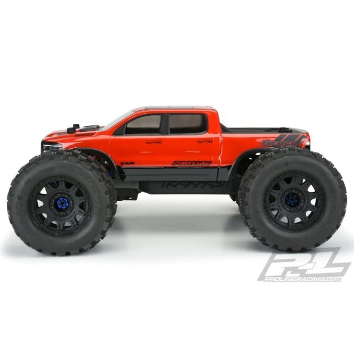 This is a Pre-Cut Ram Rebel Clear Body for E-REVO® 2.0. Pro-Line is proud to introduce the new 2020 Ram Rebel 1500 body for E-REVO® 2.0 Monster Trucks! This Ram body is perfect for giving your Monster Truck a tough and modern Ram Rebel look while also making your friends jealous. The Ram Rebel body comes clear allowing you to paint and recreate your favorite full-size Ram Rebel or Big Horn edition truck since Pro-Line includes two different grill and headlight trim options along with other detailed graphics on the sticker sheet. Just like the Brute body, the Ram Rebel is Pre-Cut and made to fit your E-REVO® 2.0 with extended body mounts and is made from durable polycarbonate. Don't show up to the local bash spot with the same body as everyone else... Get your 2020 Ram Rebel 1500 Body from Pro-Line today!