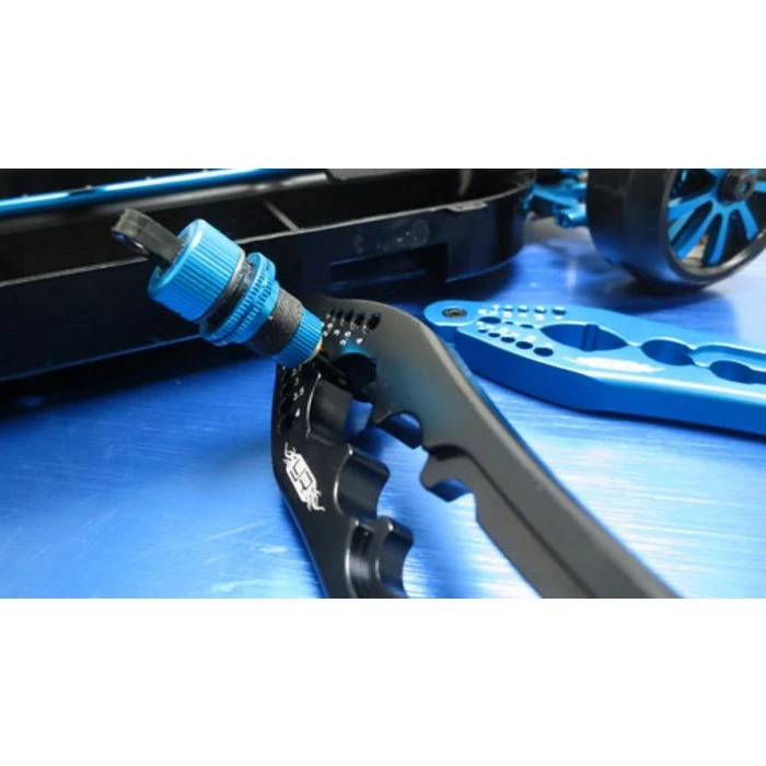 These 3 in 1 hard-anodized pliers can be used to hold shock shafts firmly, and measure pin & screw sizes! Compared to other shock pliers, it has a nicely curved grip handle at the end, which provides good hand feel and allows you to grip the shock shafts firmly.